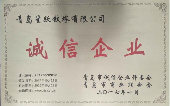 2017年度“青島市誠信企業(yè)”評選活動由青島市商業(yè)聯(lián)合會主辦。經(jīng)過深入宣傳發(fā)動、企業(yè)自薦自評、相關部門和行業(yè)協(xié)會推薦、評委會辦公室初步審核、評委會評審、社會公示等六個評段的工作,青島星躍鐵塔有限公司等60多家企業(yè)被評為2017年“青島市誠信企業(yè)”。